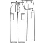 A Men's fit zip fly pull-on pant features a back elastic waistband with a button closure, functional inside drawstring, multiple belt loops and six pockets. Two front patch pockets, two cargo pockets, and two back pockets. Also featured is a signature tonal woven label and a utility twill tape. Inseam 32"